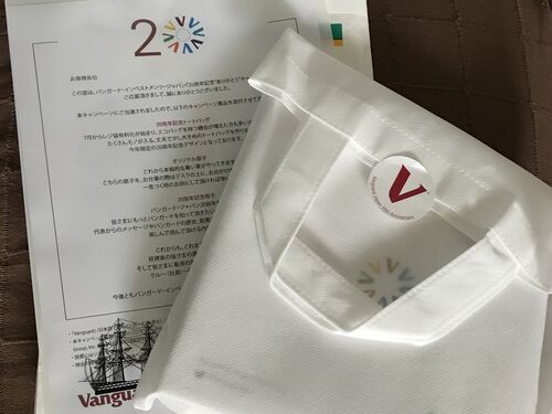 バンガード・ジャパンの設立20周年を記念した『20周年記念”ありがとう”キャンペーン』に応募したところ、当選し、賞品が届きました。 抽選100名で期待はせず応募しましたが、当選して嬉しいです。 ありがとうございました。
